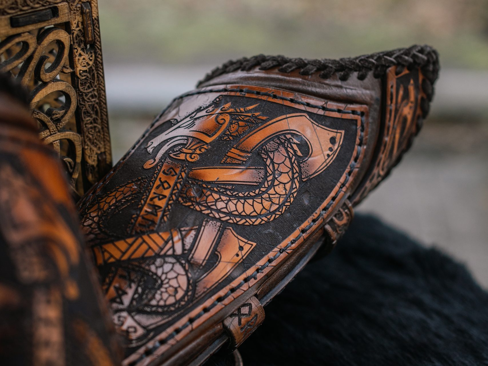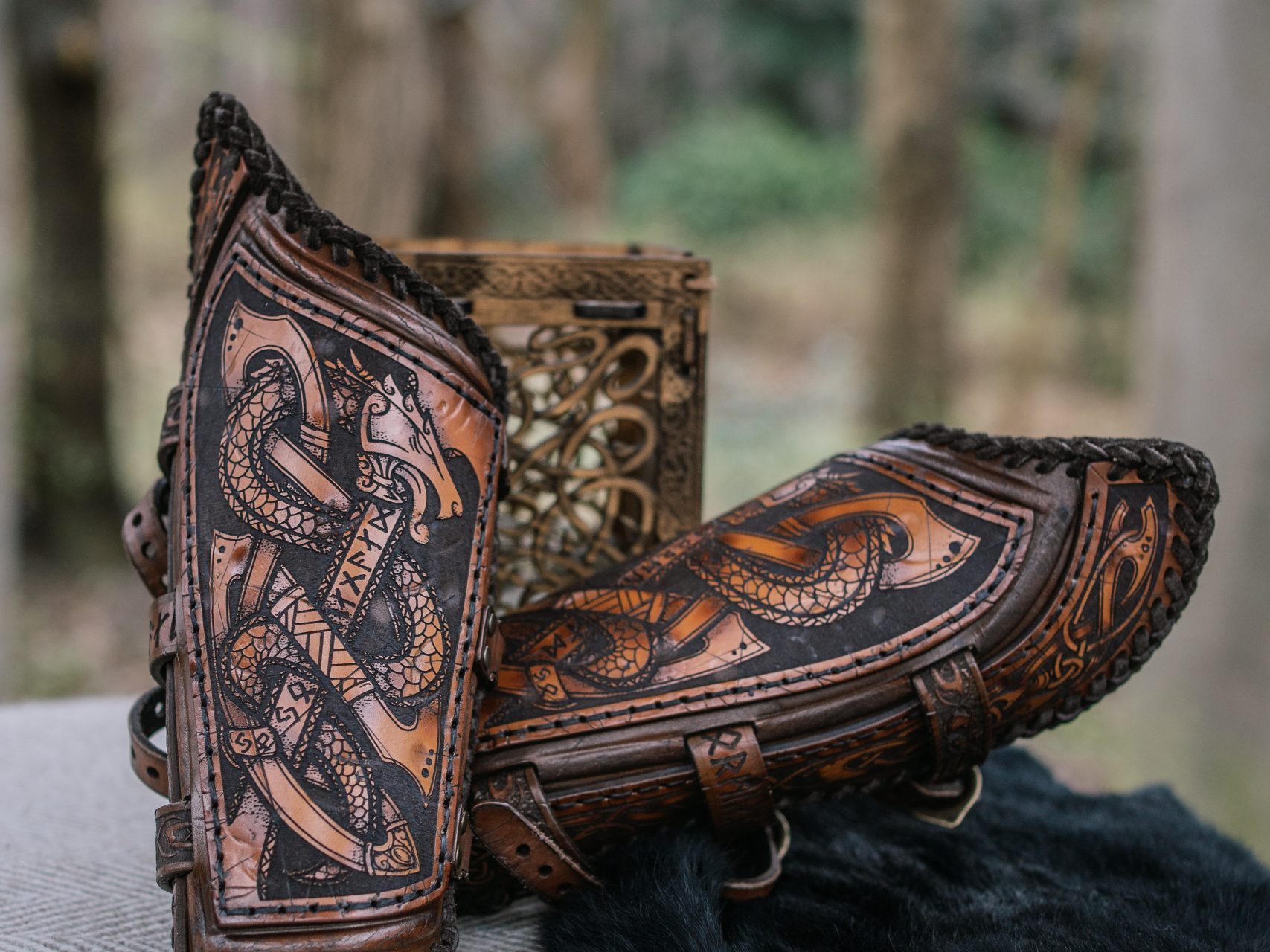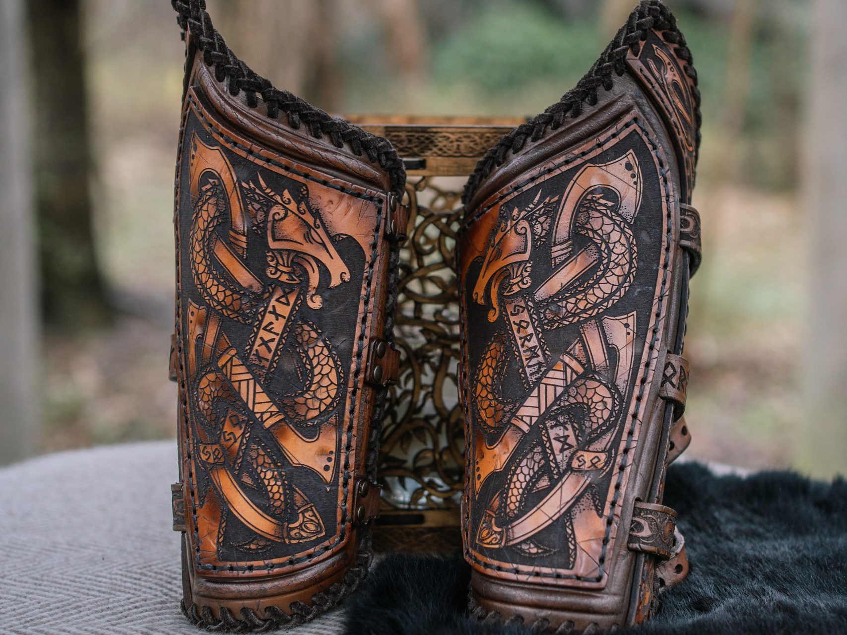 Die Jörmungandr Armschienen bestehen aus 3mm handgefärbtem Naturleder. Diese Armschienen sind angelehnt an die große Schlangenmythologie. Eine ganz andere Herangehensweise an Armschienen und definitiv ein einzigartiges Stück.