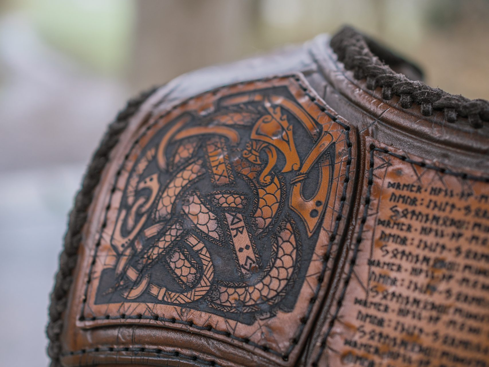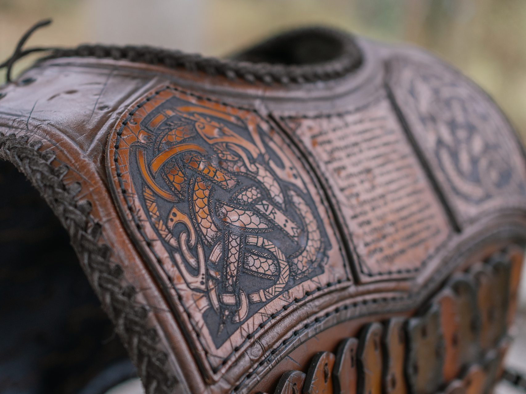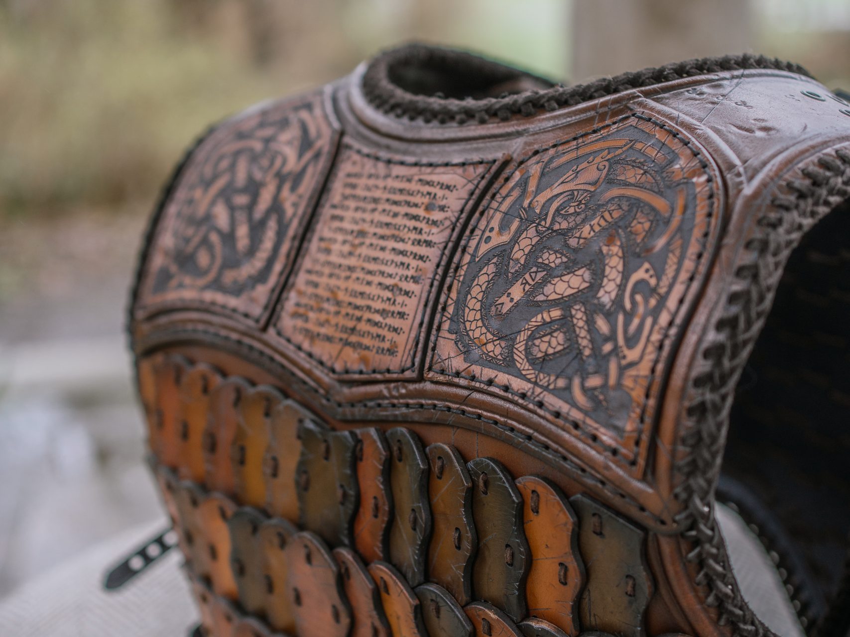 Die Jörmungandr Brustplatte ist Teil des Jörmungandr Sets. Es besteht aus 3mm Rindsleder, handgefärbt und in verschiedenen Brauntönen gefärbt, um der gesamten Rüstung ein einzigartiges Aussehen zu verleihen. Die Schuppen sind bemalt und nach dem Zufallsprinzip platziert, so dass jedes Set ein absolutes Unikat ist. Es kommt auch mit schönen Wikinger inspirierten Dekorationen und Gravuren.