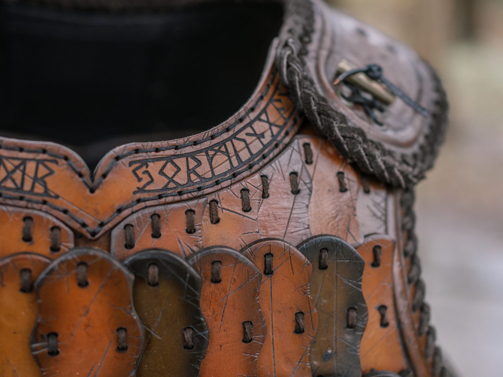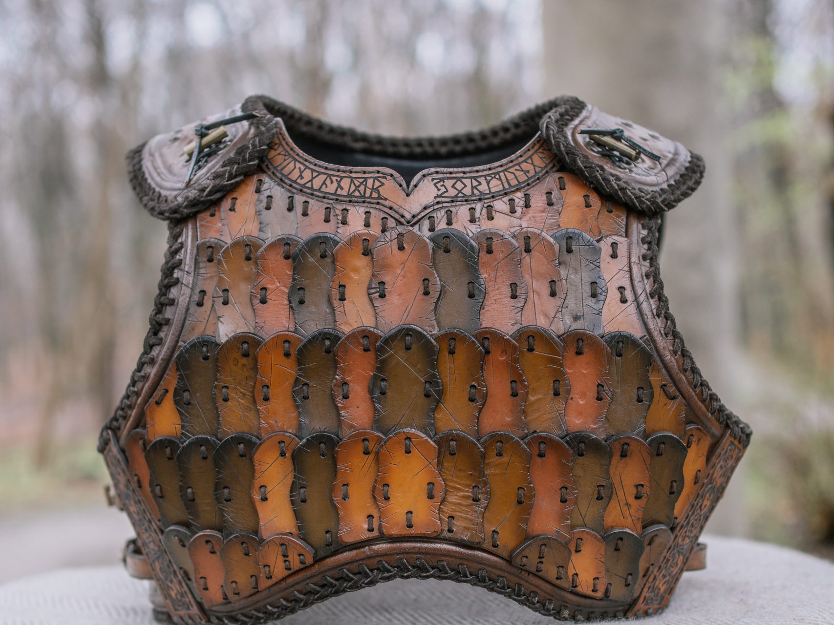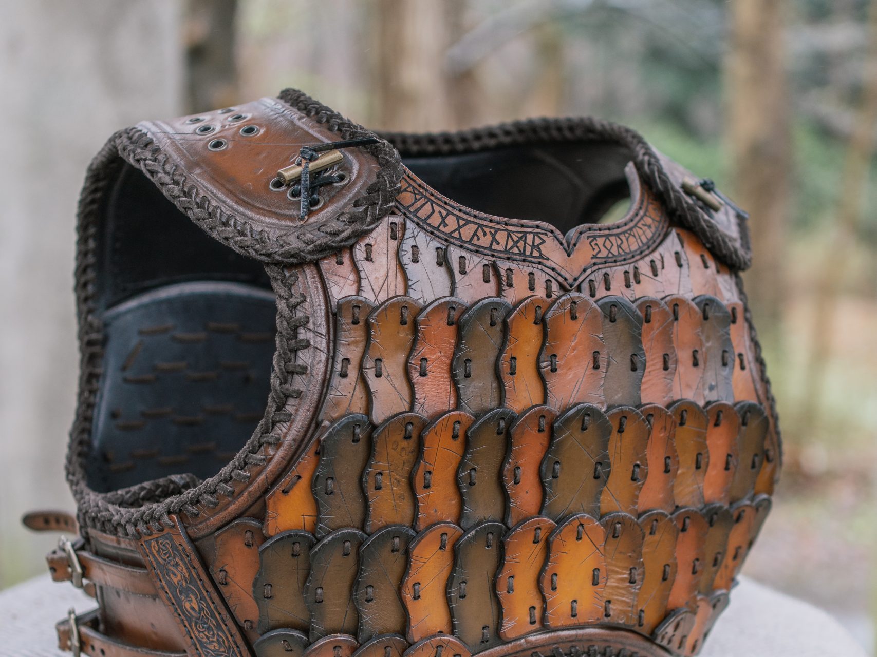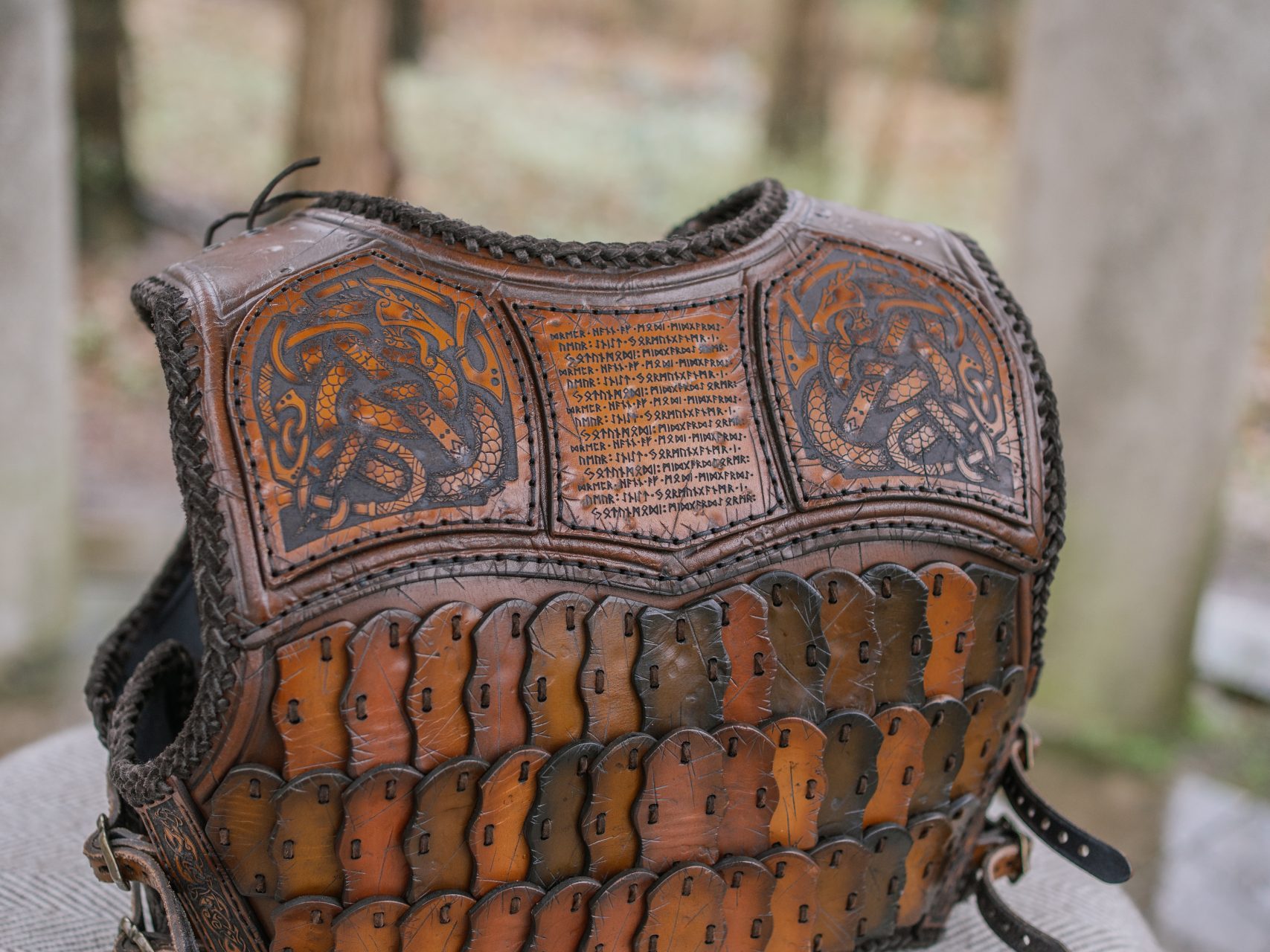 Die Jörmungandr Brustplatte ist Teil des Jörmungandr Sets. Es besteht aus 3mm Rindsleder, handgefärbt und in verschiedenen Brauntönen gefärbt, um der gesamten Rüstung ein einzigartiges Aussehen zu verleihen. Die Schuppen sind bemalt und nach dem Zufallsprinzip platziert, so dass jedes Set ein absolutes Unikat ist. Es kommt auch mit schönen Wikinger inspirierten Dekorationen und Gravuren.